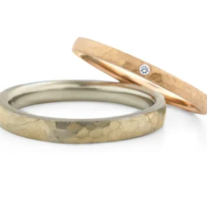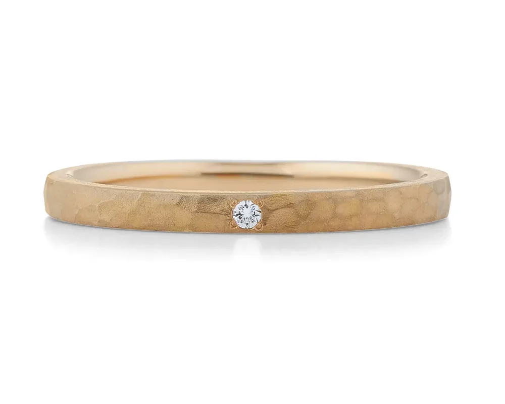 職人が丁寧に仕上げるハンマー加工の輝きは、お手元にしっくりと馴染みます。レディースの 1石のダイヤは決して分かたれることのない、永遠の絆を表現しています。