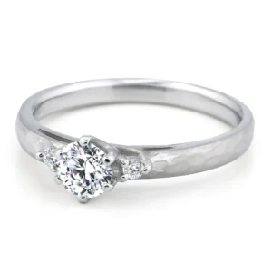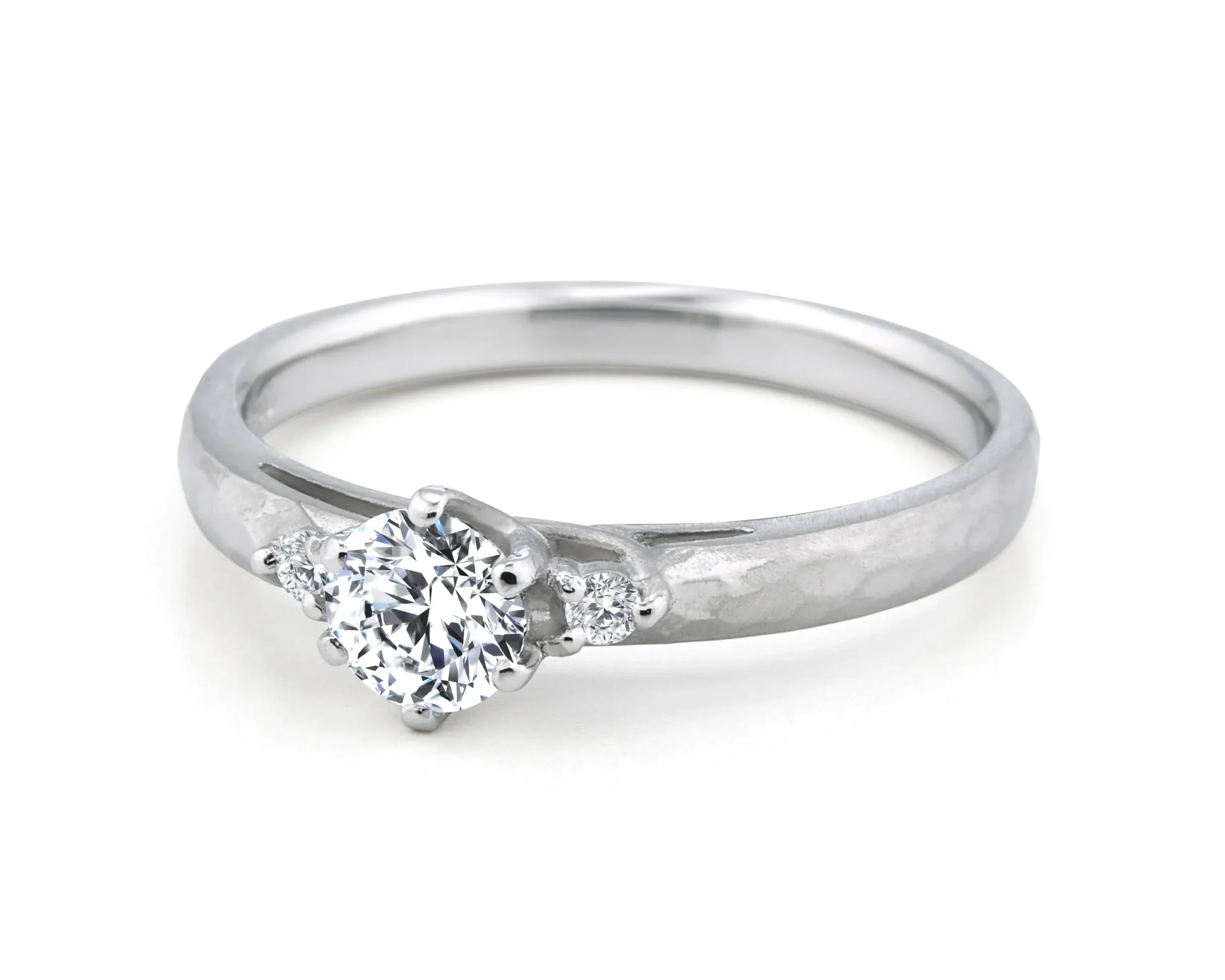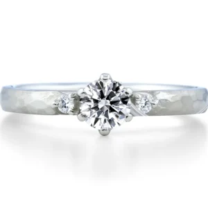 約束 約束 YAKUSOKU 【品番】 TUE001 Pt950 ¥247,500~ (税込) ※センターダイヤモンド0.2ct~ ホワイトダイヤ 槌目仕上げの凹凸が幸せを積み上げる約束の象徴に。 光を多く取り込み、ダイヤモンドの美しいシルエットが堪能できる特徴的なサイドビュー。クラフト感溢れるテクスチャーが絶妙なバランスを作り出しています。