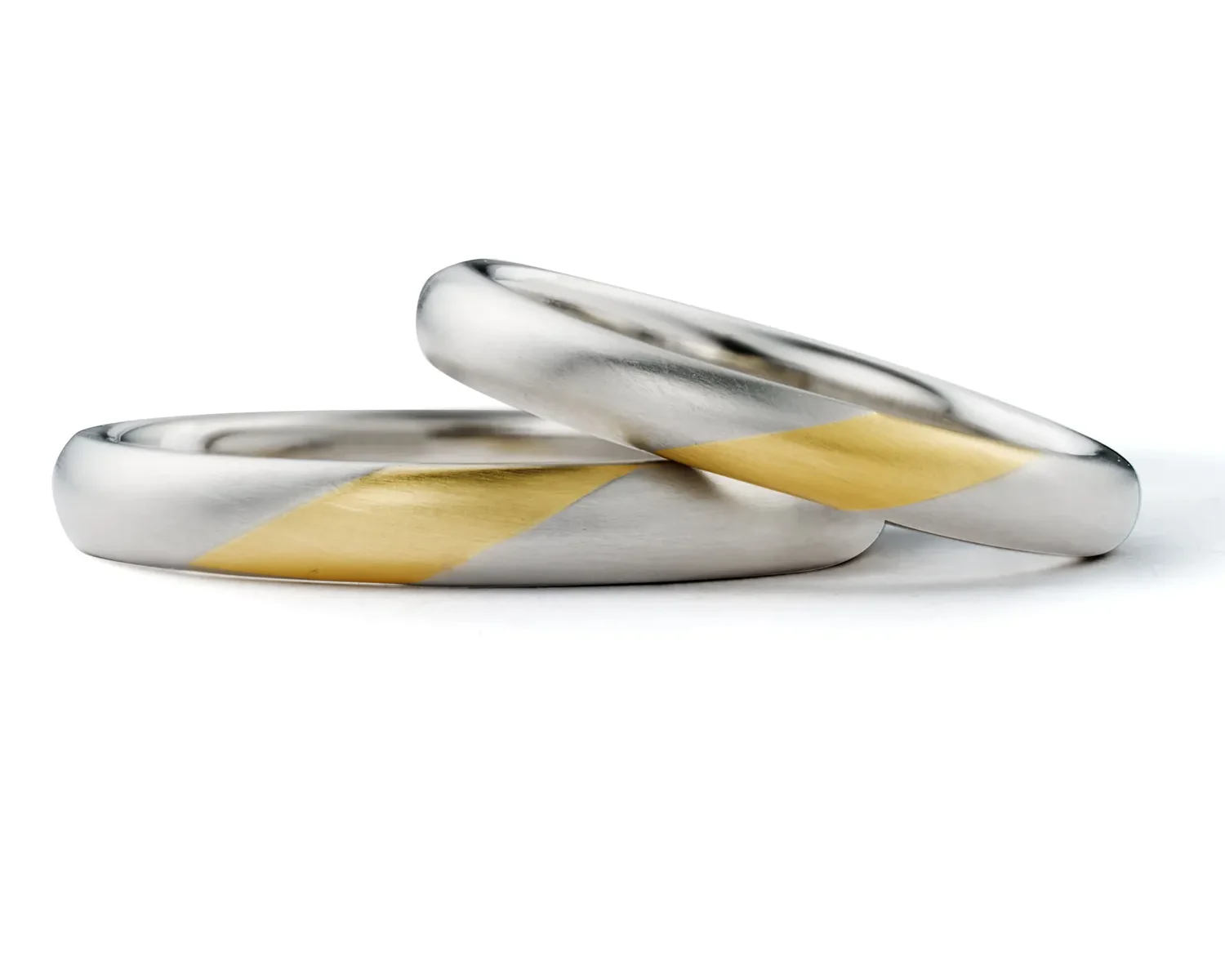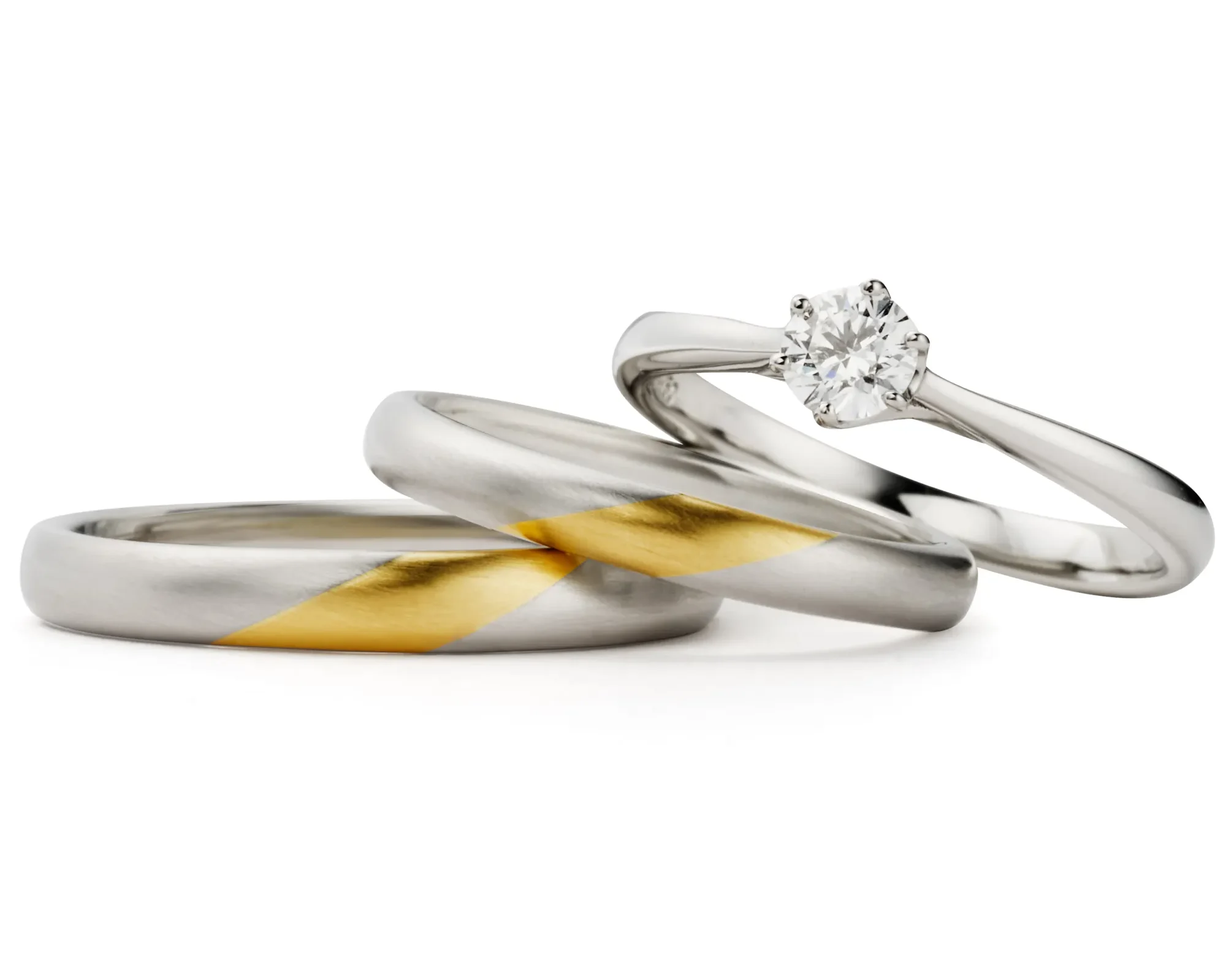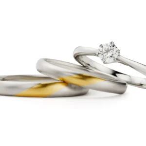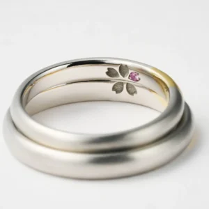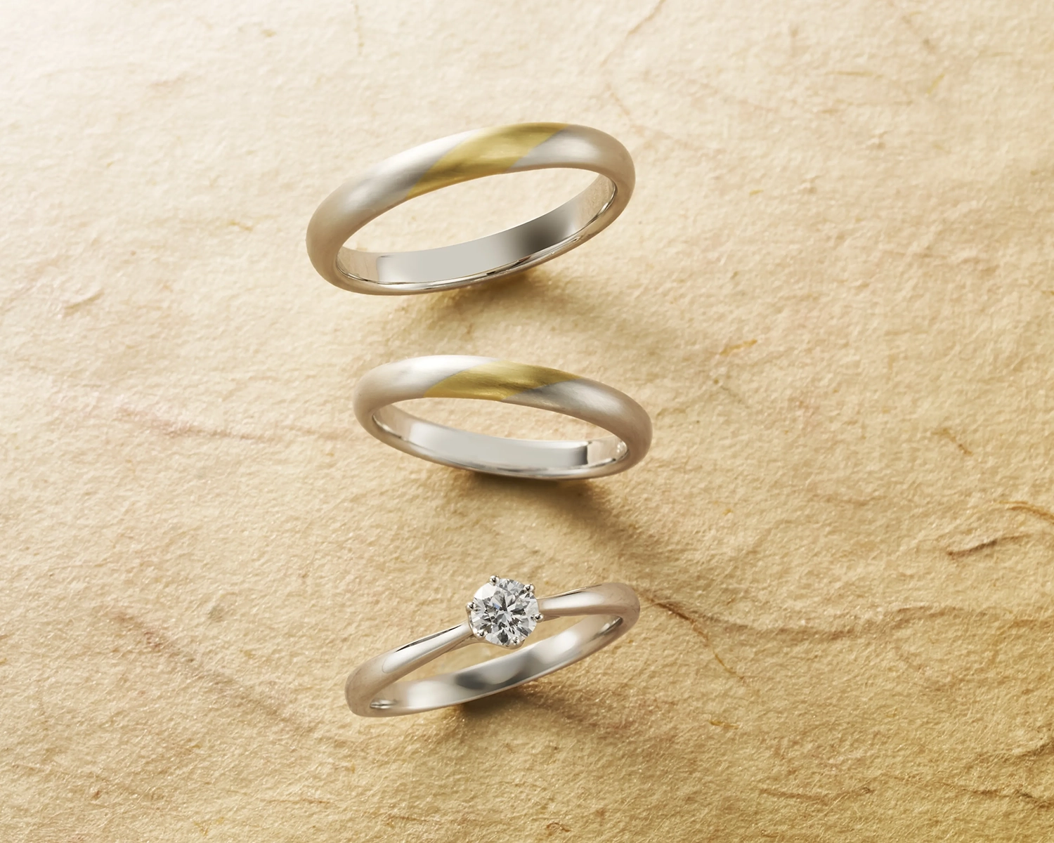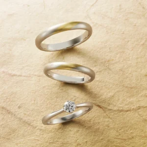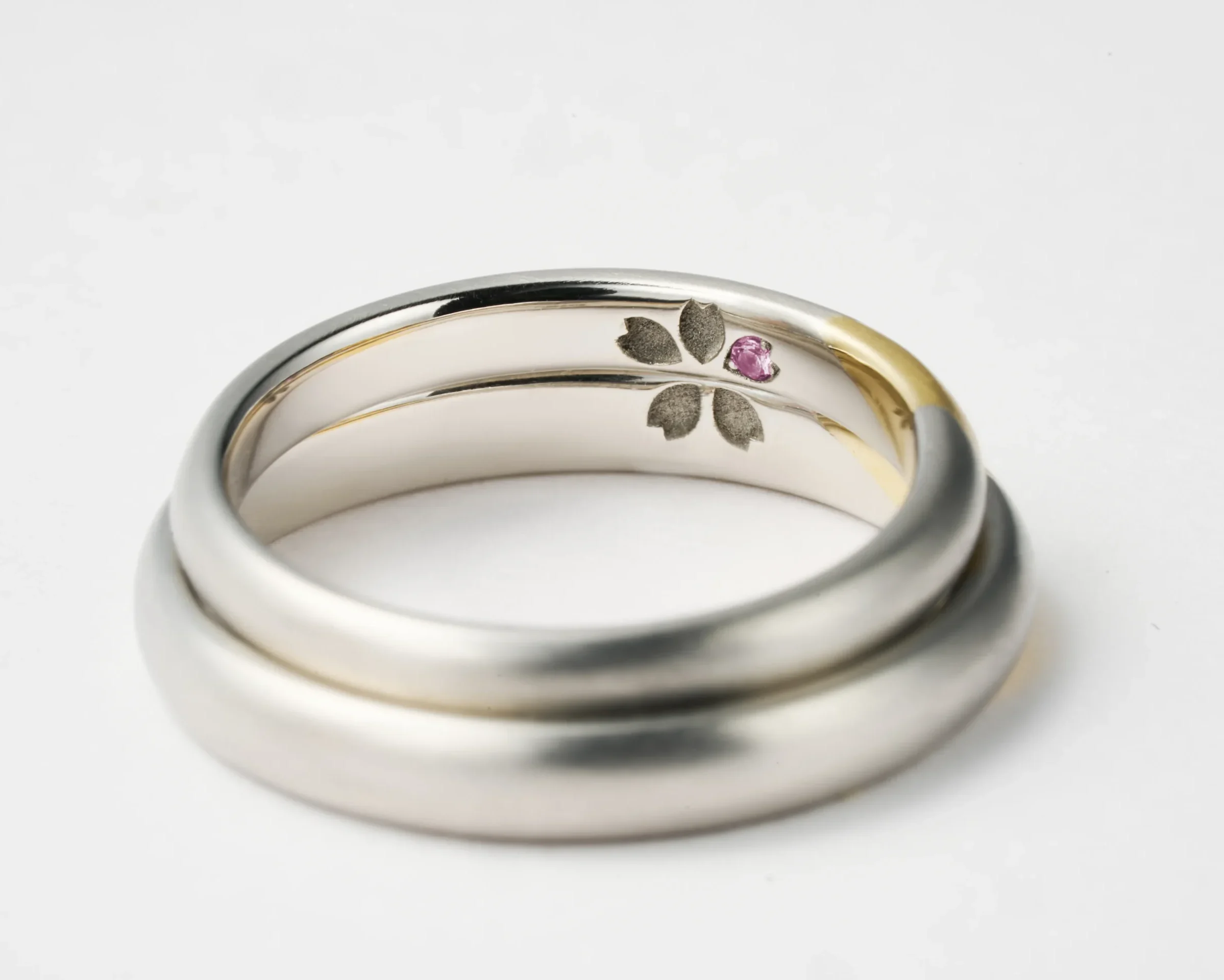 あけぼの 花露 あけぼの 花露 AKEBONO – HANATSUYU 【品番】 TUM053 W PS, TUM053 G Women’s Pt950/K18YG ¥158,400 (税込) (細幅:¥136,400) ピンクサファイア Men’s Pt950/K18YG ¥184,800 (税込) (細幅:¥160,600) 「あけぼの」は、やわらかな朝の光がモチーフ。 エンゲージリングと重ねると、ふたりの未来が力強く輝きはじめる情景を映し出します。リングの内側には「朝露に輝く桜」をイメージしたピンクのサファイアが。